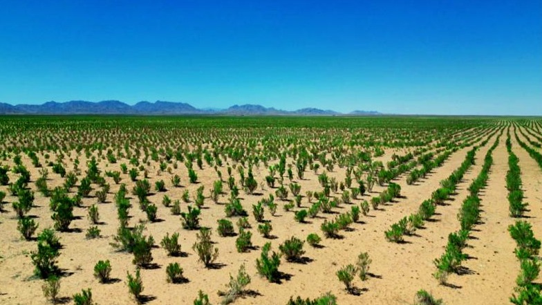 2025年7月6日,隨著巴丹吉林沙漠南緣最后一個草方格鋪設(shè)完成,一條全長1856公里的防沙阻沙鎖邊林草帶實現(xiàn)全線“合龍”,三大沙漠被牢牢“鎖”住。截至2025年底,阿拉善累計治沙面積突破1億畝。